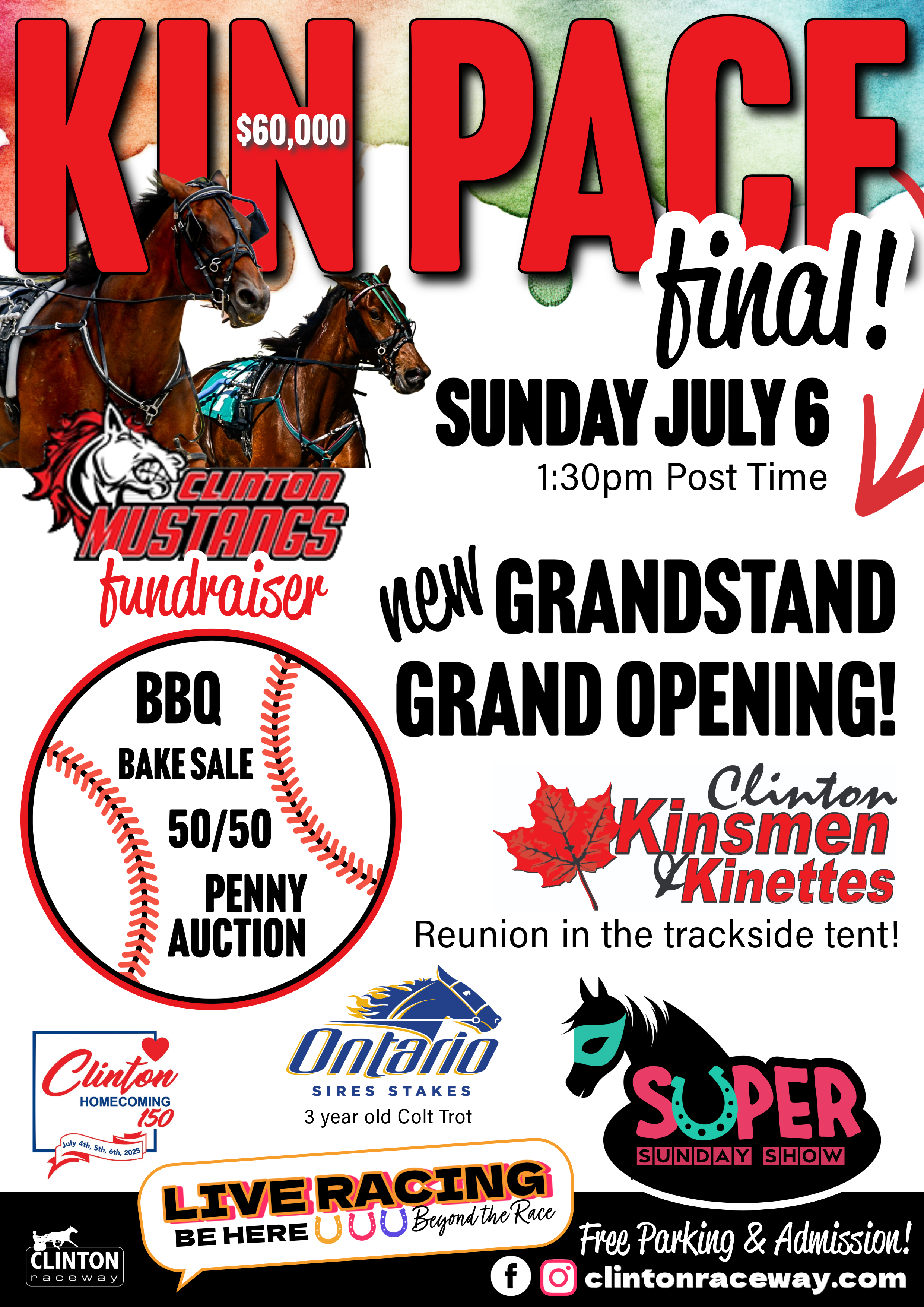 The Kin Pace pays homage to the early days of Clinton Raceway when the Kinsmen and Kinette Club introduced pari-mutuel wagering to the grassroots track in 1970. The Kin Pace plays host to Ontario Sired three-year-old pacing fillies, and has proved to be a key stepping stone for many top mares in our sport.